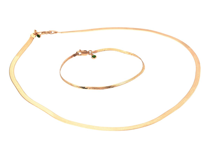 ANI JEWELS, förgyllt sterlingsilver, gröna stenar, collier, armband, halvstel länk, collier längd 42 cm, armband längd 17 cm, vikt 8,8 g.