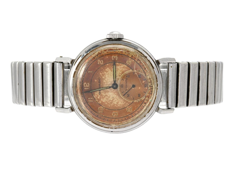 MOVADO, "Non-Magnetic", herrur, 32,5 mm, Cal. 150MN, Boett nr. 185785 / 11677, stål, manuell, plexiglas (skadat), liten sekundvisare, skadad urtavla, gravyr, ca 1945, metallänk ej original.