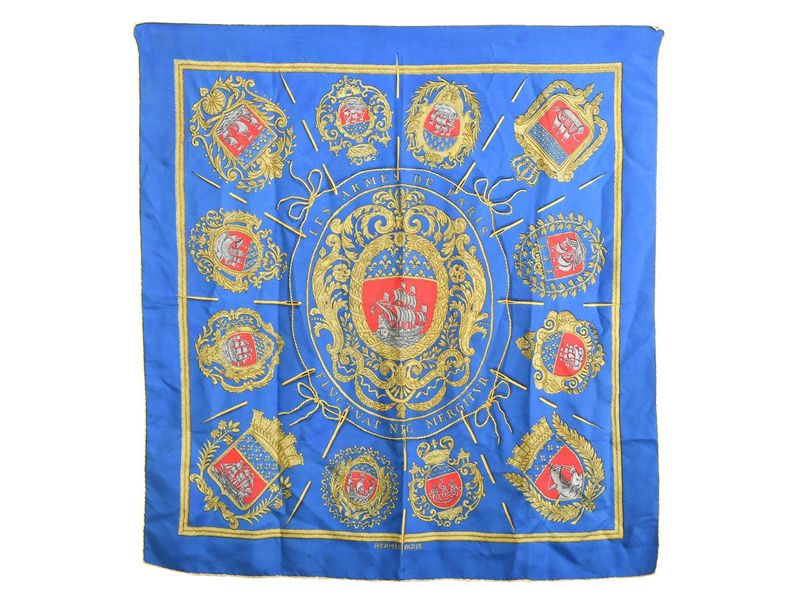 SCARF, HERMÈS, Les Armes de Paris, Hugo Grygkar, 100% siden, 88x82 cm, blå, gul röd, fläckar, tråddragning.