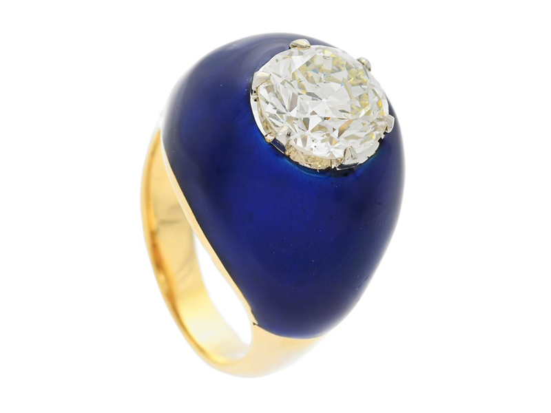RING, 18K guld, blå emaljdekor, gammalslipad diamant ca 2,30 ct, ca TCa(L)/SI2, troligen Viginio Leva, Valenza, Italien 1900-talets mitt, stl 15,75 mm, vikt 11,5 g, etui.