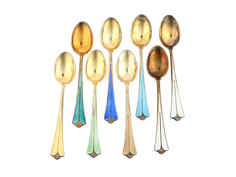 DAVID ANDERSEN, kaffeskedar, 8 st, silver, emalj, Danmark, vikt 79,4 g