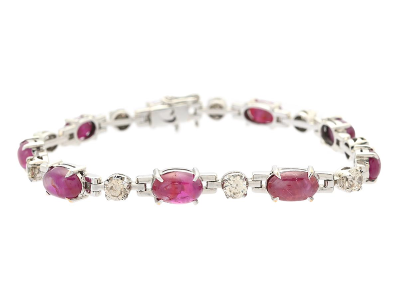 ARMBAND, 14K vitguld, cabochonslipade rubiner, briljantslipade diamanter ca 1,41 ctv, ca TCa-Ca(K-N)/VS-P, längd 16,5 cm, vikt 13,6 g, stenar med nagg och skador.