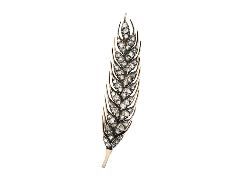 BROSCH, 14K guld/silver, rosenslipade diamanter, antik, längd 65 mm, vikt 6,2 g, flera diamanter med nagg och skador, etui.