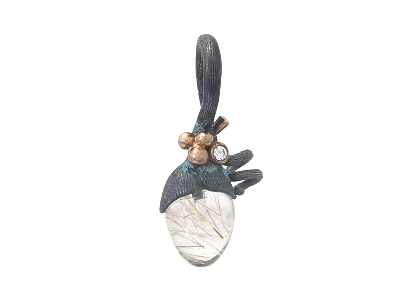 OLE LYNGGAARD, hänge, Sprout, oxiderat silver/18K guld, rutilkvarts, briljantslipad diamant 0,01 ct, höjd 26 mm, vikt 2,9 g.