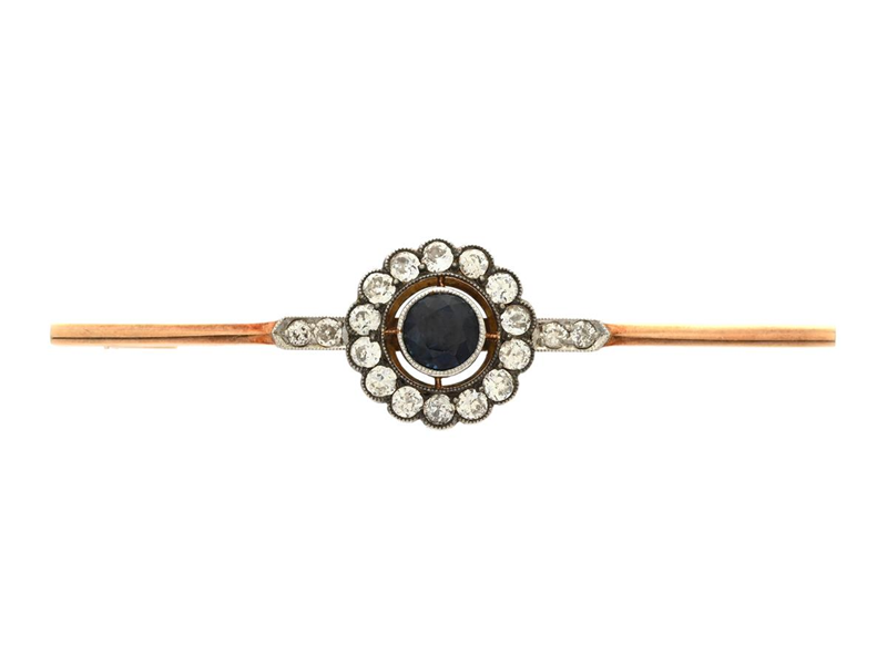 BROSCH, 14K guld/platina, rundslipad safir ca 1,0 ct, gammalslipade diamanter ca 0,82 ctv, ca W-Cr/SI-P, längd 6,0 cm, Helsingfors 1952, vikt 6,2 g,