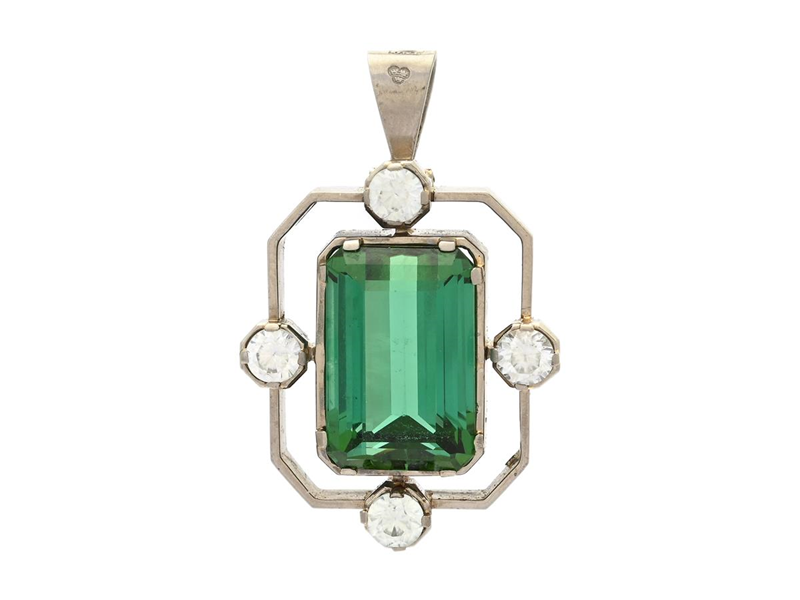 HÄNGE, 18K vitguld, smaragdslipad turmalin ca 12,5 ct, 4 st zirkoner ca 1,6 ctv, Owen & Larsson Co Larsson Stockholm, 1900-talets mitt, mått 35 x 23 mm, vikt 11,5 g.