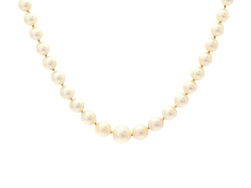 PÄRLCOLLIER, odlade pärlor ca 3,5-6,6 mm, doserat, lås i 18K guld /platina, rosenslipade diamanter, G Dahlgren & Co, Malmö 1936, längd 48,5 mm, vikt 12,1 g, etui.