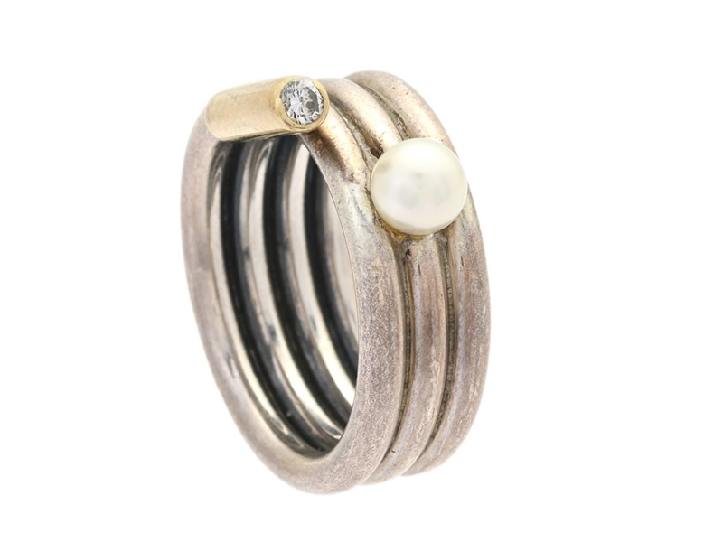 DAVID ANDERSEN, ring, silver/18K guld, odlad pärla ca 5,0 mm, briljantslipad diamant ca 0,05 ct, ca TW/VS, stl 17,25 mm, vikt 11,5 g, sliten fattning.