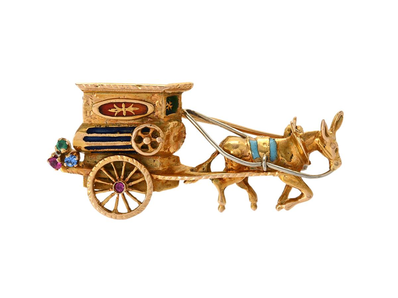 BROSCH 18K guld, åsna med kärra, emaljdekor, 3 st färgstenar, vikt 5,7 g,