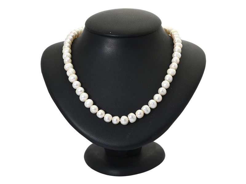 PÄRLCOLLIER, odlade barocka sötvattenspärlor ca 8,0-9,5 mm, lås i 18K guld, längd 51 cm.