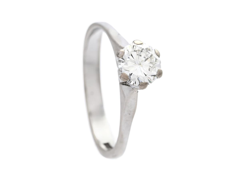 ENSTENSRING, 18K vitguld, briljantslipad diamant ca 0,79 ct, ca TW(F)/SI1, Juvelateljen Per-G Forslund, Malmö 1981, stl 17,5 mm, vikt 3,5 g, slitage, diamanten har flertalet skador vid rondisten.