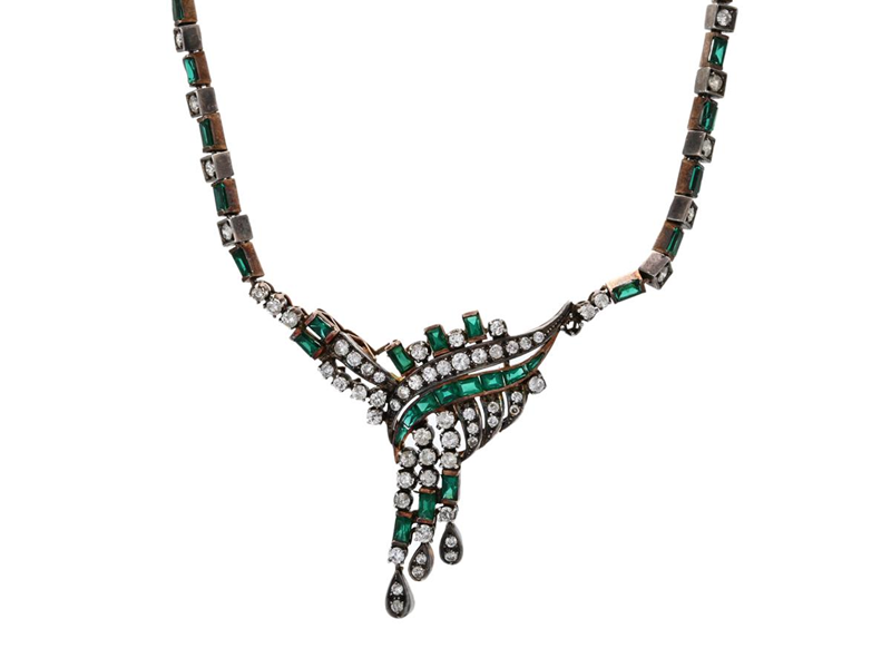 COLLIER, 14K/silver, 77 briljantslipade diamanter ca 3,2 ctv, ca W-Cr/SI-P, grönt glas, höjd 4,8 cm, längd ca 45 cm, vikt 26,6 g, några stenar saknas, någg på flera stenar.