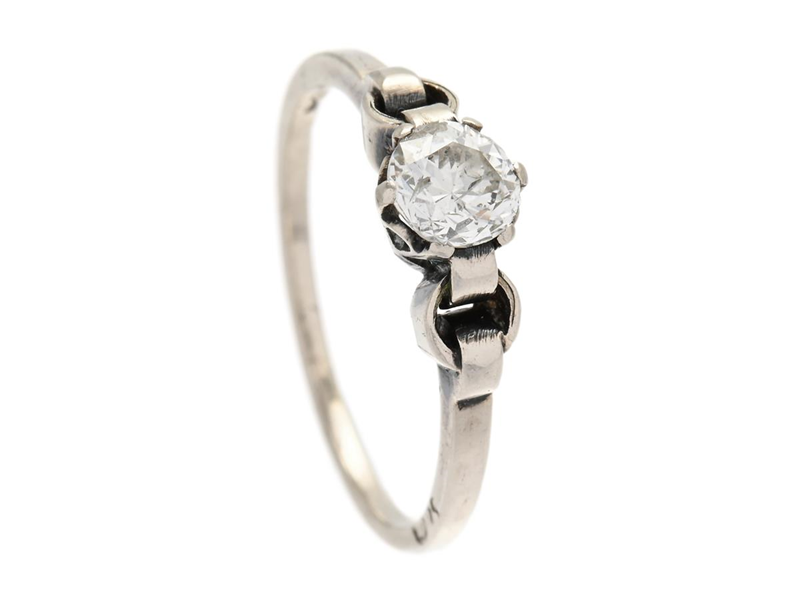 ENSTENSRING, 18K vitguld, antikslipad diamant 0.44 ct, W/P, stl 16,75 mm, vikt ca 1,7 g. nagg på rondisten, slitna klor.