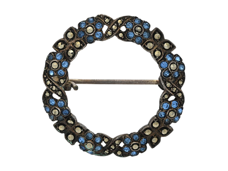 BROSCH, silver, glas, markasiter, diameter 27 mm, vikt 4,4 g, en sten saknas,