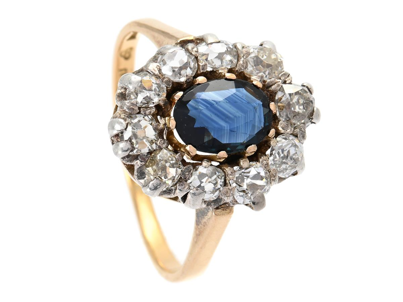 CARMOSÉRING, 18K guld, ovalslipad safir, antikslipade diamanter ca 1,00 ctv, ca W-Ca/VS-P, Stockholm 1946, stl 17,25+ mm, vikt 3,6 g, några diamanter med nagg, slitna fattningar.