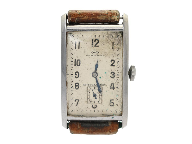 IWC, Schaffahusen, "Anti-Magnet/Tonneau", herrur, 22 x 33 (38,5) mm, Cal 87, Serie nr. 944434, Boett nr. 988744, stål (Staybrite), manuell, plexiglas (skadat), liten sekundvisare, skadad urtavla, formverk, fasta bandstift, läderband, ca 1935.