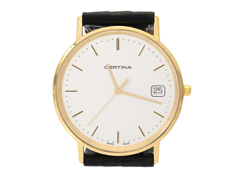 CERTINA, Priska, Serie nr. CBR6JJP28, Ref nr. C158.9289.68.11, Boett nr. 158.9289.68, herrur, 33,5 mm, 18K gud, quartz, safirglas, datum, läderband, originalspänne i doublé, cert, maj 2024, box, ytterkartong.