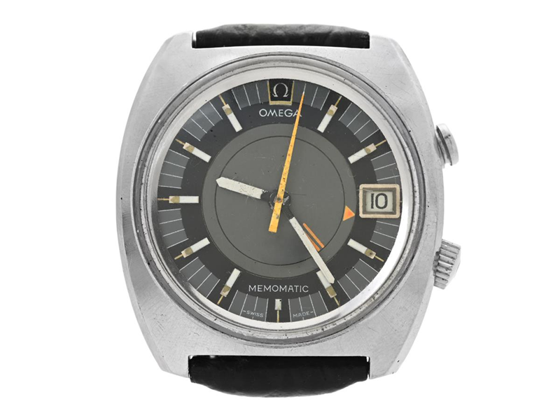 OMEGA, Seamaster, Memomatic (-Swiss Made-), Cal 980, Serie nr. 30014172, Ref nr. ST 166.0072, Boett nr. 166.072, herrur, 39 x 50 mm, stål, automatisk, plexiglas, datum, alarm, målade visare, skadad urtavla, defekt (akut servicebehov), läderband, ca 1969.