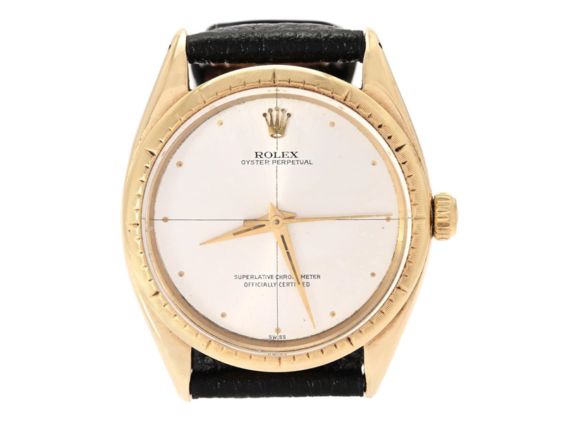 ROLEX, Oyster Perpetual (Swiss), Chronometer, s.k. "Zephyr Dial", Ref nr. 1008, Serie nr. 714x15x, Cal 1560, Verk nr. D65796, Boett nr. 1008, herrur, 34,5 mm, 14K guld, automatisk, plexiglas, skadad urtavla, läderband, ca 1961.