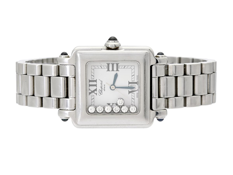 CHOPARD, Genève, Happy Sport, Serie nr. 954949, Boett nr. 27/8249-23 / 8325, damur, 27 x 24,5 (36,5) mm, stål, quartz, safirglas , datum, "Happy diamonds", briljanter (7 st. 0,39 ctv), läderband, originallänk, viklås, cert (ej komplett), ca 2010, box, ytterkartong.