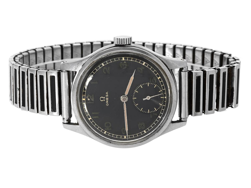 OMEGA, Suverän, Cal 30 T2 PC, Serie nr. 10580863, Ref nr. CK 2400, Boett nr. 2400-5 / 161, herrur, 35 mm, stål, manuell, plexiglas, liten sekundvisare, skadad urtavla, gravyr, ca 1945, metallänk ej original.