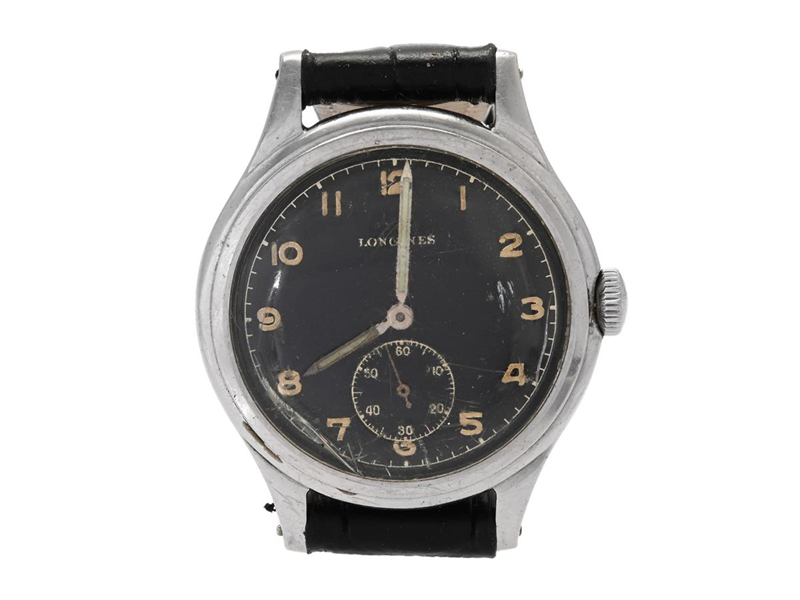 LONGINES, herrur, 33 mm, Cal 23.M, Serie nr. 6864248, Boett nr. 22968/48, stål, manuell, plexiglas (skadat), liten sekundvisare, skadad urtavla, läderband, ca 1946.