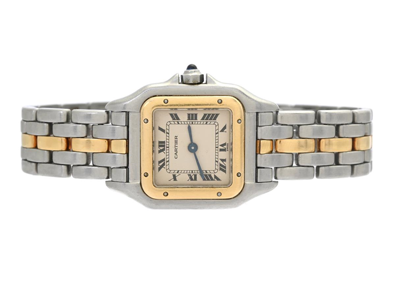 CARTIER, Panthère, Cal 157, Boett nr. 66921027484, damur, 22 x 22 (29,5) mm, stål/guld, quartz, safirglas (repa), skadad urtavla, originallänk (1-radig), viklås, ca 1985, box (ej komplett).