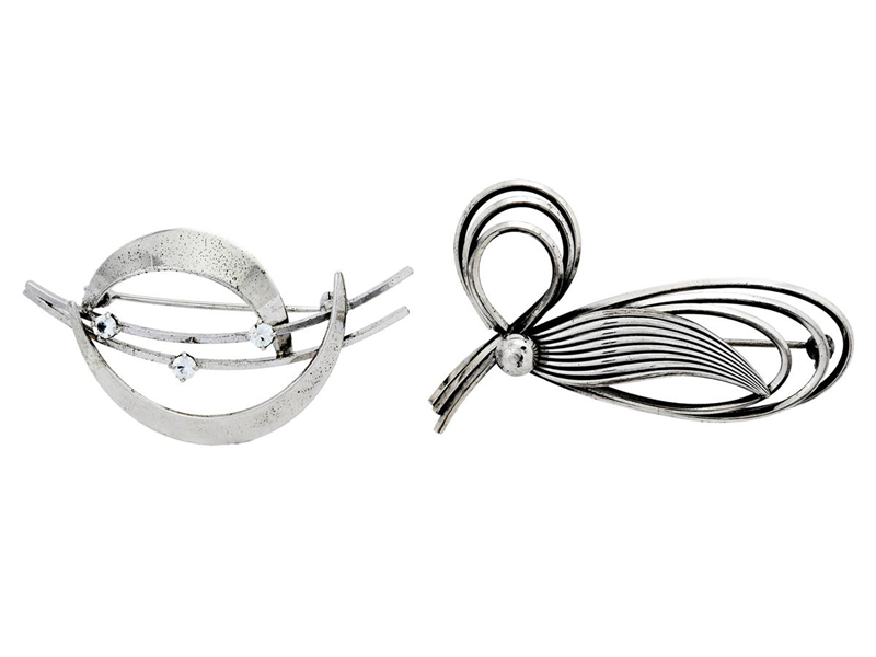 SMYCKESET, silver, 2 st broscher, vita stenar, bredd 4,5/4,8 cm, totalvikt 9,6 g.