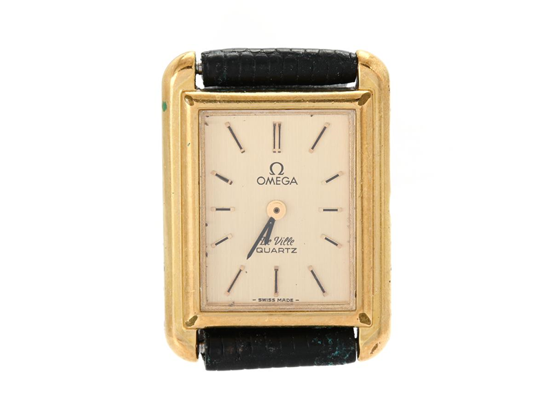 OMEGA, De Ville, Cal 1353, Serie nr. 44013177, Ref nr. MD 591.0029, Boett nr. 591.0029, damur, 20 x 20 mm, doublé (20 micron), quartz, mineralglas, skadad urtavla, defekt, läderband, originalspänne i doublé, ca 1980.