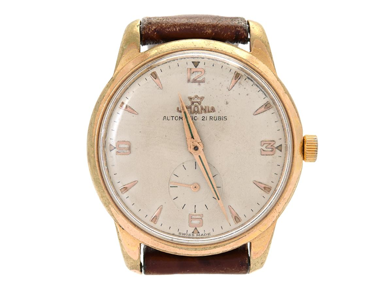 LEMANIA, herrur, 35 mm, Cal 360, Serie nr. 1003397, Boett nr. 866-63, doublé (skadad, 20 micron), automatisk, plexiglas, liten sekundvisare, skadad urtavla, defekt (akut servicebehov), OBS: saknar bakpackning, läderband (skadat), ca 1957.