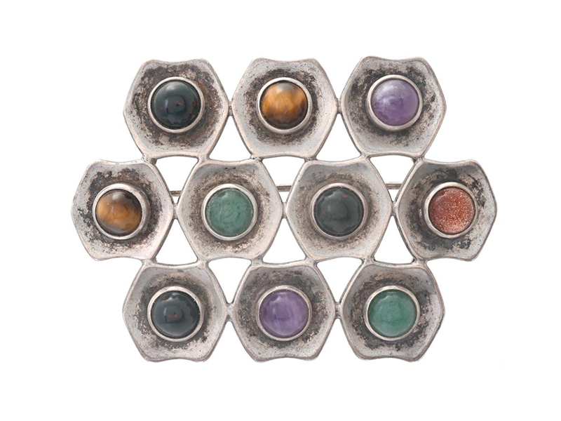 BROSCH, silver, aventurinkvarts, heliotrop, tigeröga, ametist och sk "goldstone", Stockholm 1963, mått 52x37 mm, vikt 22,0 g.