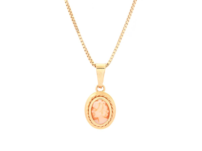 HÄNGE MED KEDJA, 18K guld, kamédam, venezialänk, längd på kedja 44,5 cm, vikt 3,4 g.
