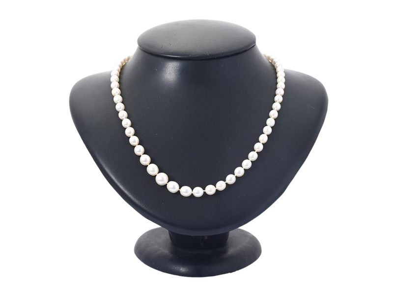 PÄRLCOLLIER, odlade pärlor, doserad ca 8,0 - 4,0 mm, lås i silver, längd ca 55 cm, vikt 20,5 g.