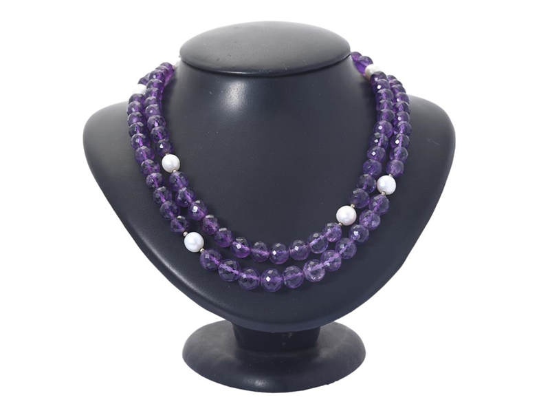 COLLIER, facetterade ametister, odlade sötvattenspärlor, vitmetall, längd ca 90 cm, vikt 102,3 g.