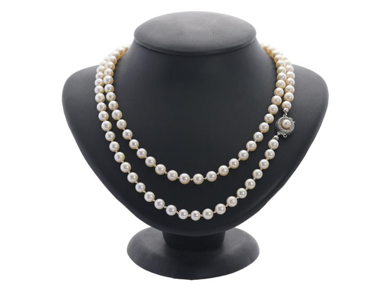 PÄRLCOLLIER, odlade pärlor ca 4,5 mm, lås i silver, längd 94 cm, vikt 41,5 g, skört silke.