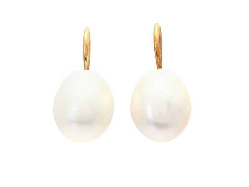 KLARLUND, pärlörhängen, 14K guld, odlade sötvattenspärlor ca 11,3x14,7 mm, höjd 28 mm, vikt 5,9 g, krokar, etui, ytterask.