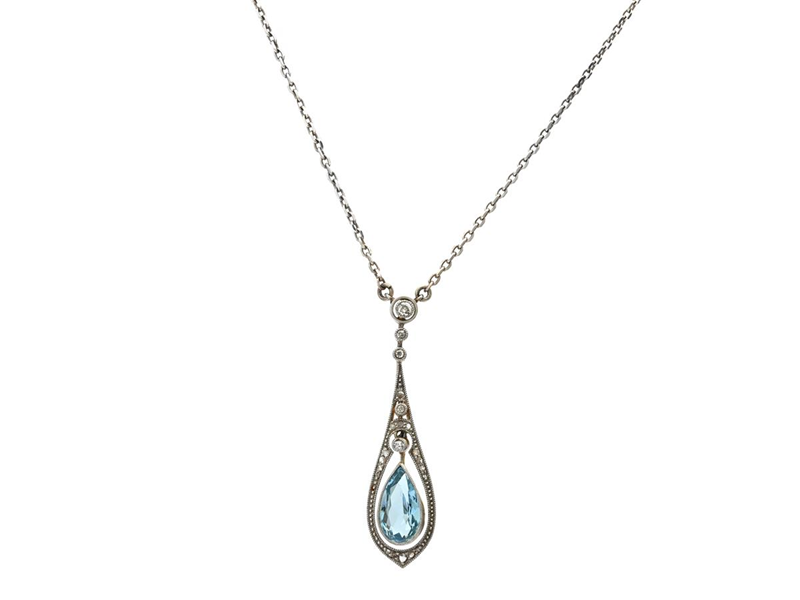 COLLIER, hänge i guld/platina, kedja silver, droppslipad akvamarin, åttkant och rosenslipade diamanter, längd 40 cm, vikt 4,6 g