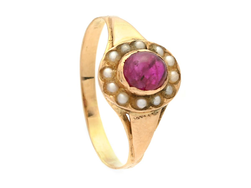 RING, 18K guld, cabochonslipad rubin, halvpärlor, stl 16,75 mm, vikt 1,8 g, skador på rubinen och inneslutningar som når ytan, limrester på pärlorna.