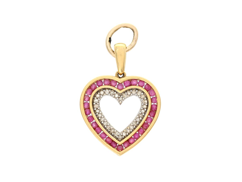 HÄNGE, 18K guld, hjärta, rubiner, 29 åttkantslipade diamanter ca 0,15 ctv, ca 25 x 15 mm, vikt 2,7 g.