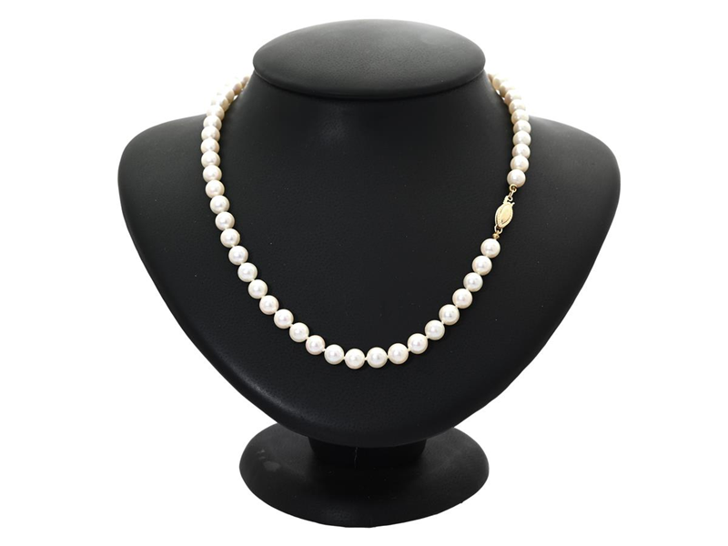 PÄRLCOLLIER, odlade pärlor ca 6 mm, lås i 14K guld, längd 42 cm, vikt 20,6 g.