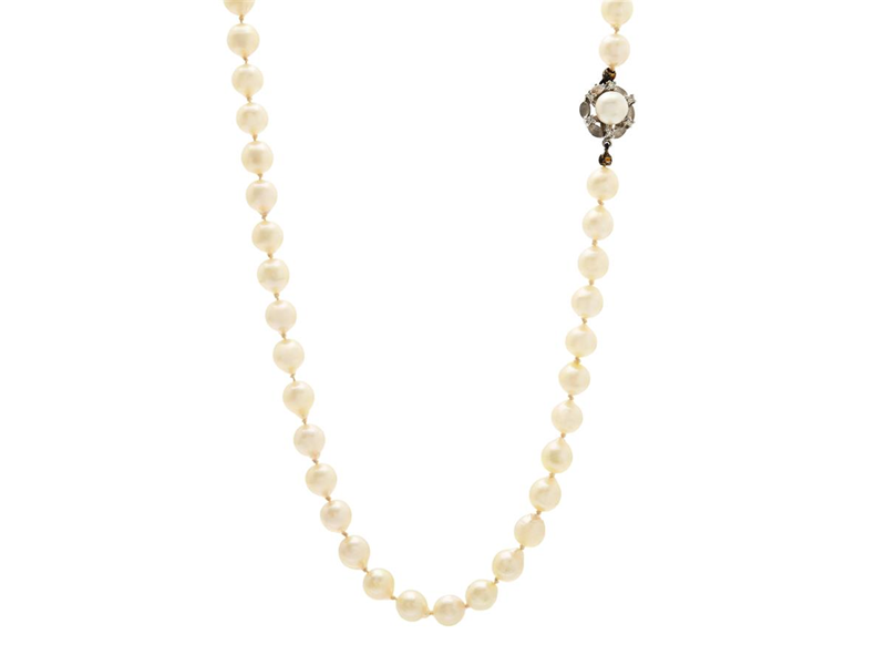PÄRLCOLLIER, odlade pärlor ca 7,5 mm, off round, lås i 18K vitguld, åttkantslipade diamanter, längd 73 cm, vikt 45,4 g.
