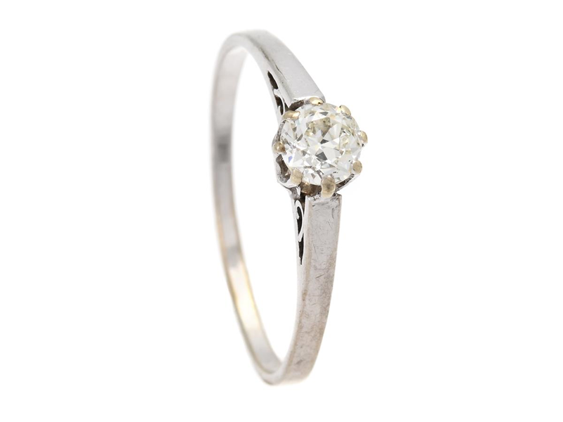 ENSTENSRING, 14K vitguld, gammalslipad diamant ca 0,40 ct, ca TCr/SI, stl 19 mm, vikt 1,6 g, diamanten har nagg invid rondisten.