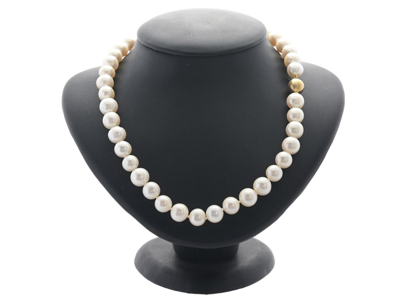 PÄRLCOLLIER, odlade pärlor, ca 9-10 mm, med lås i 18K guld, längd 46 cm, vikt 60,8 g.