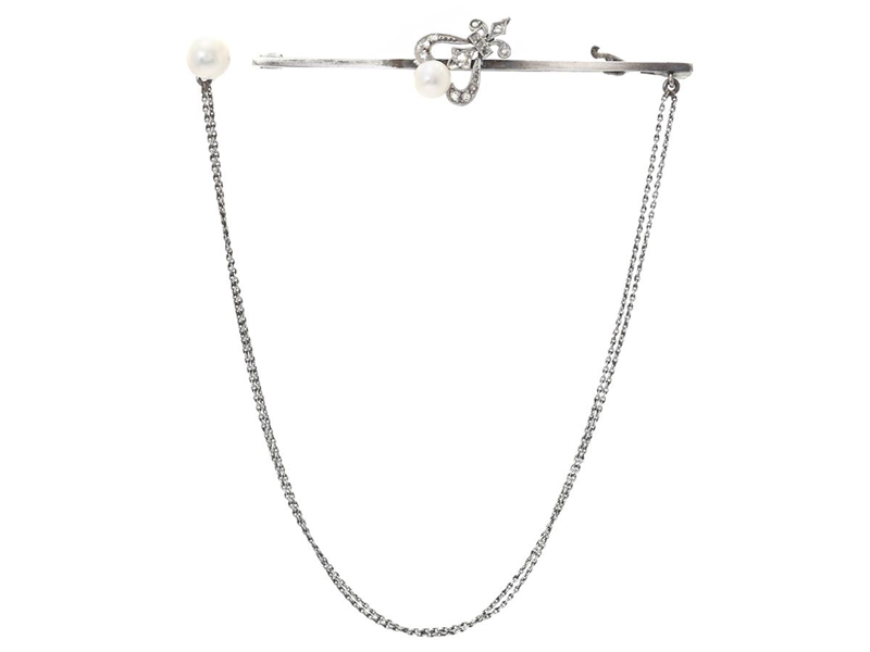 BROSCH/NÅL, silver/guld, rosenslipade diamanter, flodpärla/odlad pärla, Erlandsson K M, Ystad 1918, längd 65 mm, vikt 5,9 g.