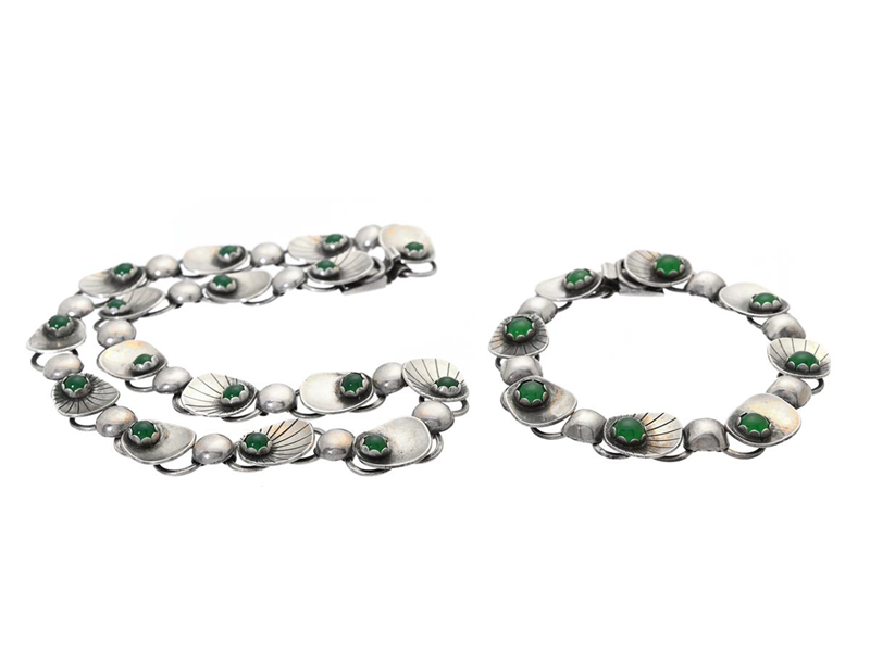 ALTON, smyckeset, collier, armband, silver, grön kalcedon, Falköping 1955 1957 längd armband 18 cm, längd collier 38 cm, vikt 65,8 g.
