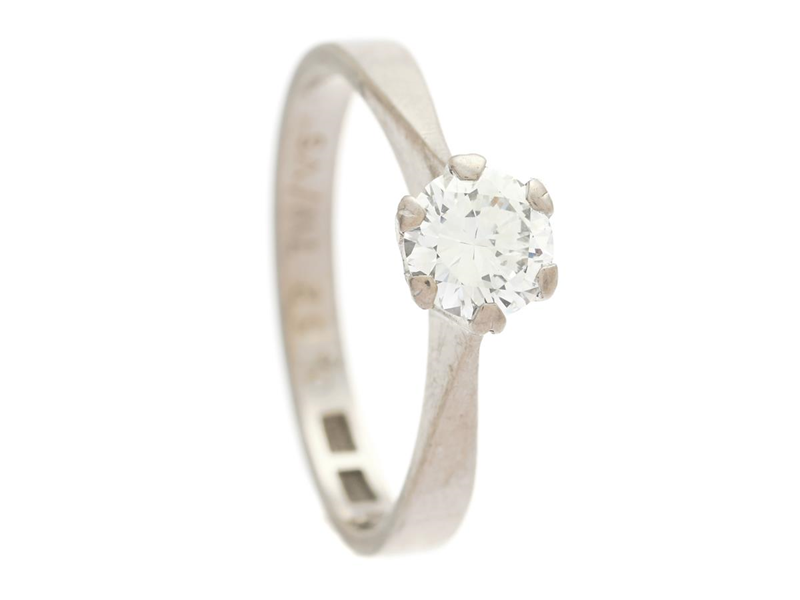 ENSTENSRING, 18K vitguld, briljantslipad diamant 0,52 ct enligt gravyr, TW/VS enligt gravyr, stl 16,75 mm, vikt 3,2 g, i behov av rodinering, nagg på kulett.