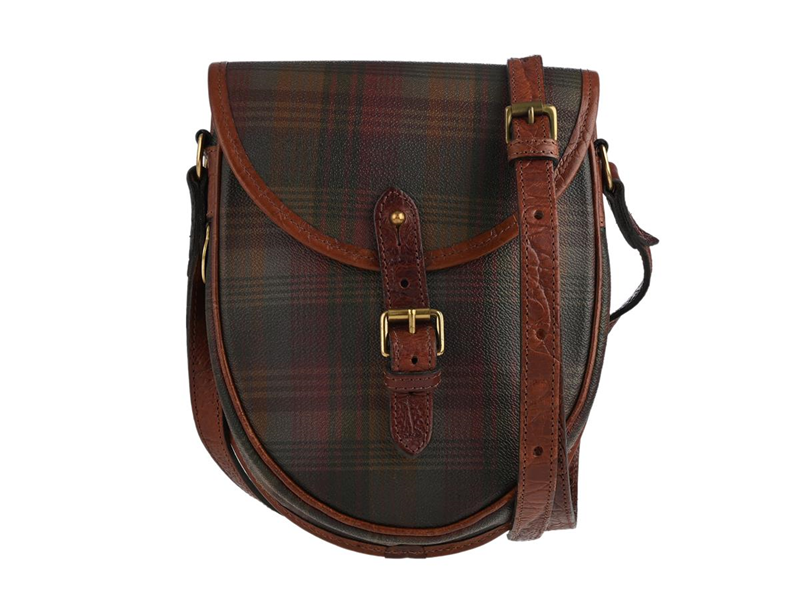VÄSKA, MULBERRY, brun, röd, grön, blå rutig canvas, brunt läder, mässingfärgade beslag, 17x21x4 cm.