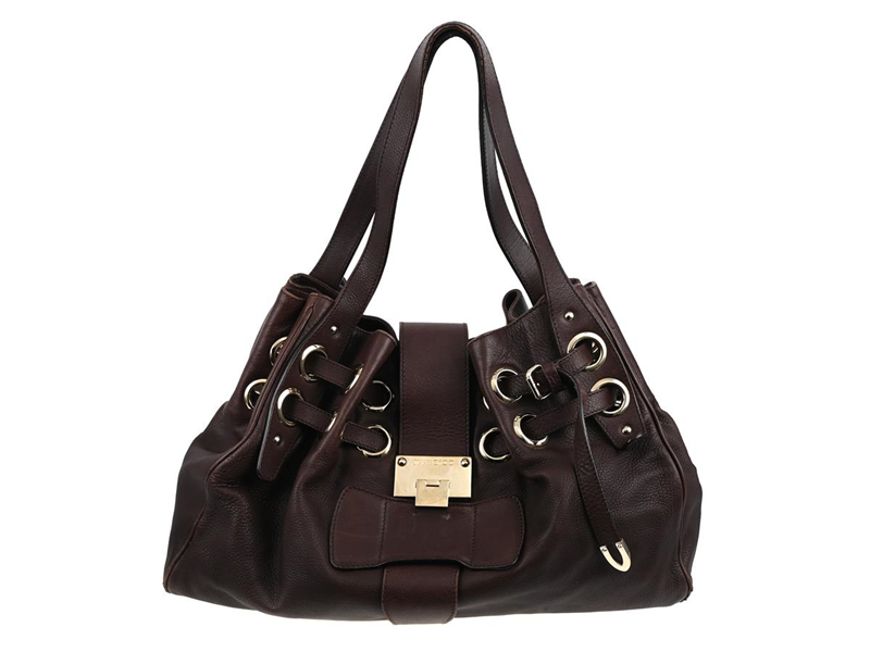 VÄSKA, JIMMY CHOO, mörkbrunt/lila skinn, silverfärgade beslag, 40x30x12 cm, bruksslitage.
