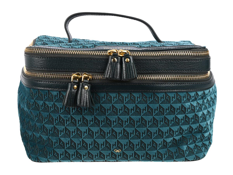 NECESSÄR, BITS & BOBS, grönt sammet. mörkgrönt läder, guldfärgade beslag, 25x13x17 cm,