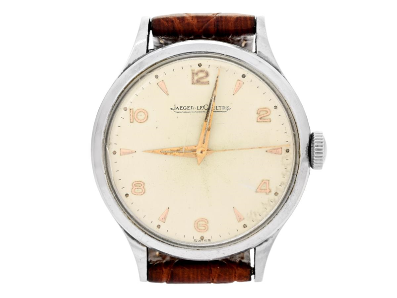 JAEGER-LE COULTRE, herrur, 33,5 mm, Cal P478/C, Serie nr. 1060581, Boett nr. 631332, stål, manuell, plexiglas (skadat), skadad urtavla/visare, läderband, ca 1955.